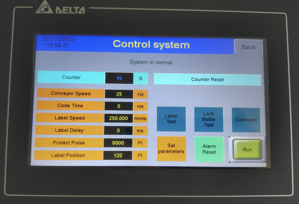 Кнопка счетчика бутылок в HMI позволяет машине остановиться, когда заданное количество было промаркировано.